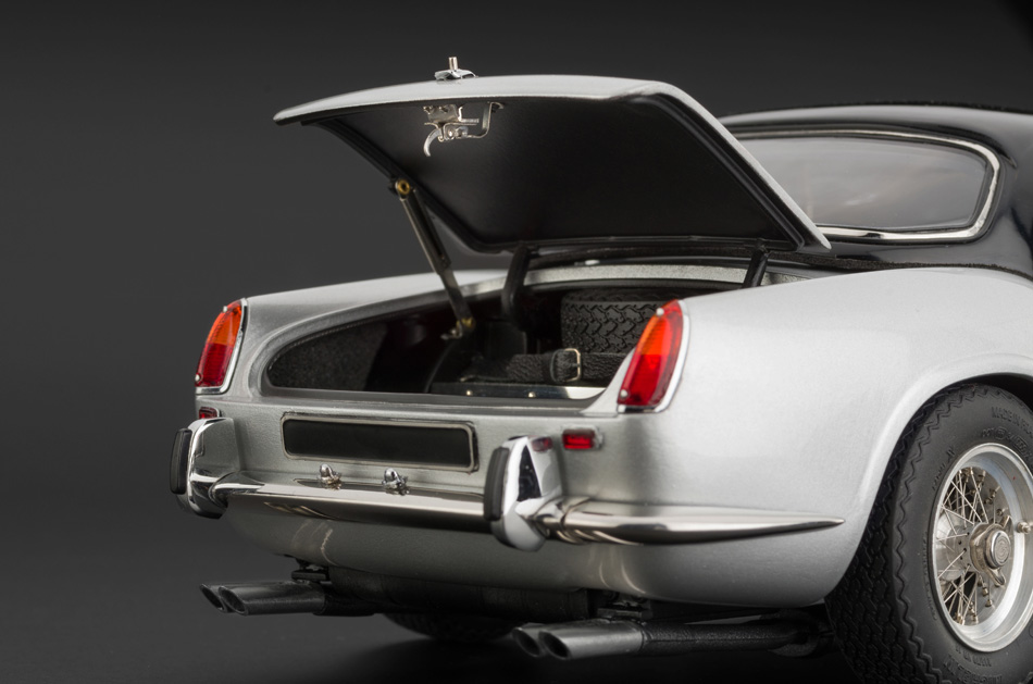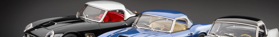 Von den insgesamt zwischen 1958 bis 1963 gebauten 105 Autos, aufgeteilt in ca. 50 LWB und 55 SWB waren diverse Vertreter auf der Film-Leinwand zu bestaunen. CMC hat sich bei ihrem Modell für die Straßenversion des SWB-California Spyders entschieden mit abgedeckten Scheinwerfern und zusätzlichen Stoßstangen-Hörnern. Als Besonderheit erhalten die limitierten Modell- Versionen in der Außenlackierung blau, silber und schwarz das früher von Ferrari sehr selten angebotene Werks-Hardtop als loses Bauteil mitgeliefert.