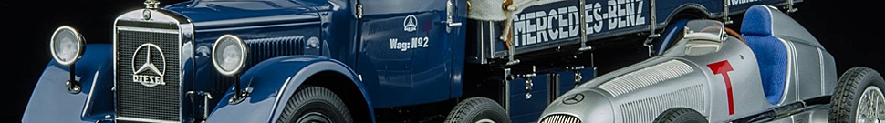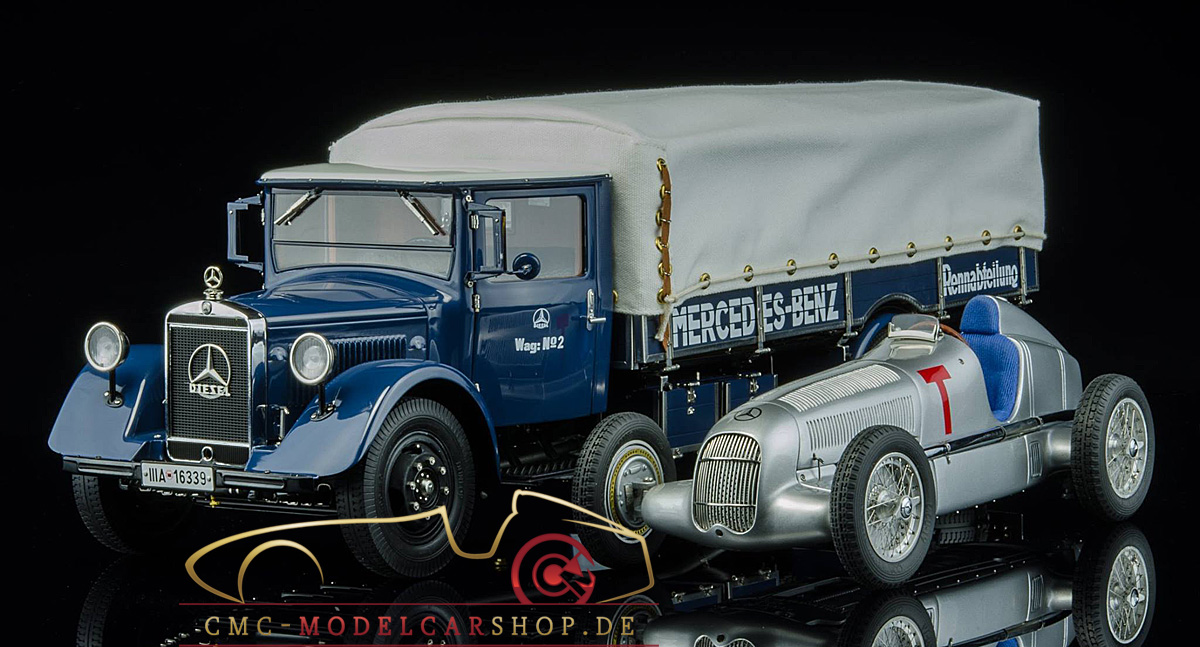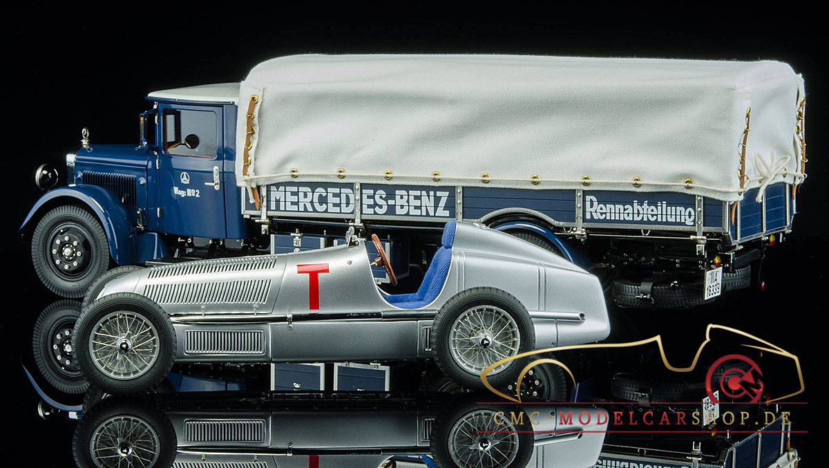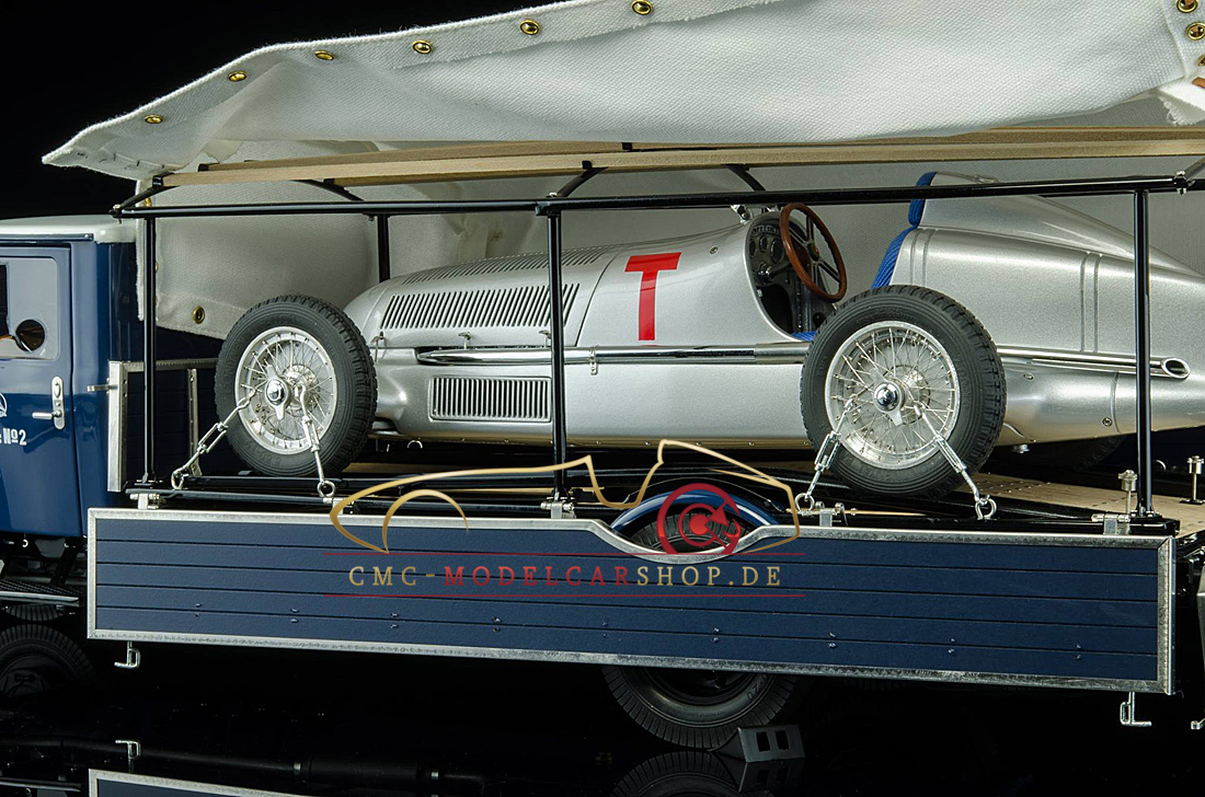 With this limited set, CMC are introducing a Mercedes-Benz LO 2750 Racecar Truck with wagon number #2 and a Grand Prix training version of the Mercedes-Benz W25 Silver Arrow marked with a "T" instead of the starting-number.