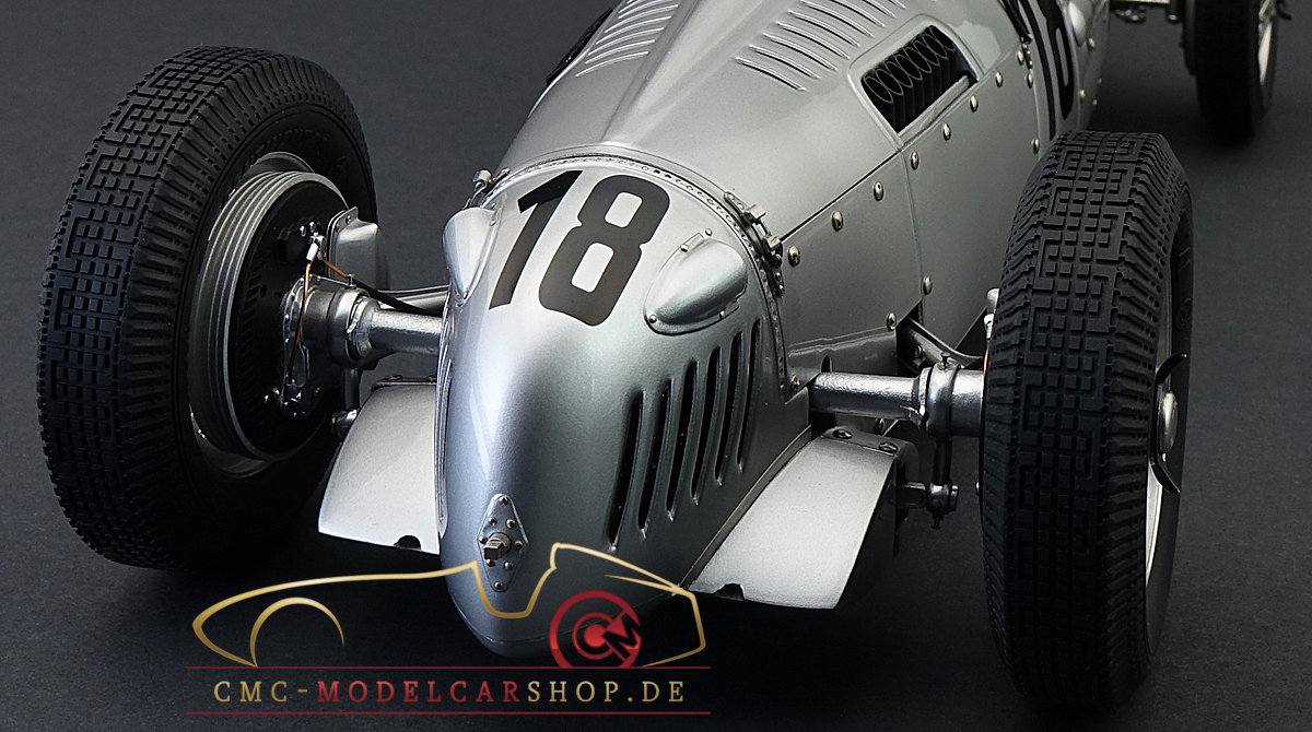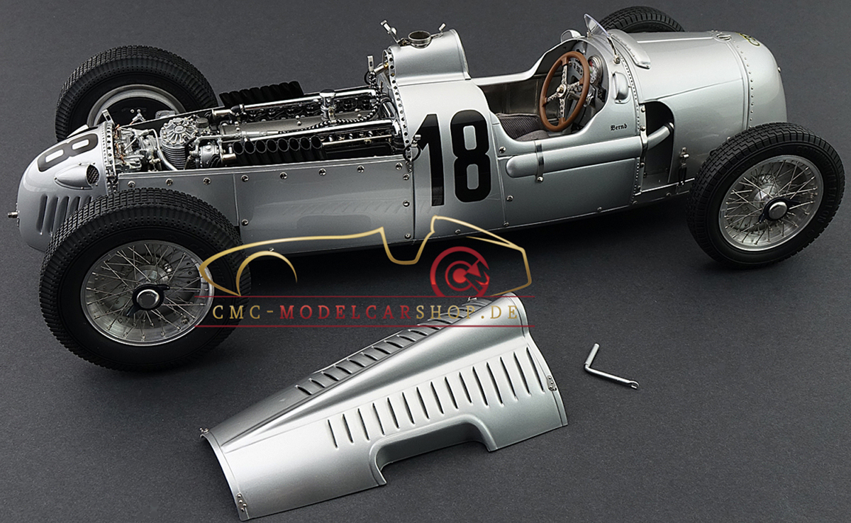 CMC a déjà annoncé son modèle géant de l'Auto Union Type C avec le numéro de départ 5. D'autres recherches sur ce véhicule, cependant, ont révélé une voiture essentiellement identique avec le numér 18, qui était descendu dans l'histoire de la course, avec son génial pilote Bernd Rosemeyer. En accord avec Audi Tradition, CMC a décidé de répliquer la voiture numéro 18 à la place. Votre compréhension sera appréciée.