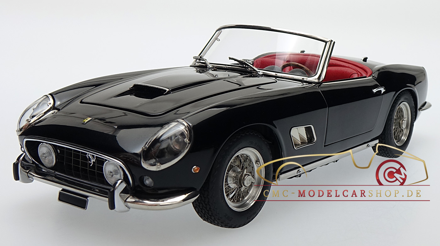 Des 105 voitures construites dans l'ensemble entre 1958 et 1963, divisée en environ 50 LWB et 55 SWB que divers représentants sur l'écran de cinéma étaient à émerveiller. CMC a décidé dans son modèle pour la version de route de SWB California Spyders avec projecteurs couverts et des cornes de pare-chocs supplémentaire. Comme une fonction spéciale, que le modèle de CMC limited edition sera livré avec les versions à l'extérieur peinture argent et très rarement offerts plus tôt par le toit rigide noir usine de Ferrari comme un bleu partie lâche.