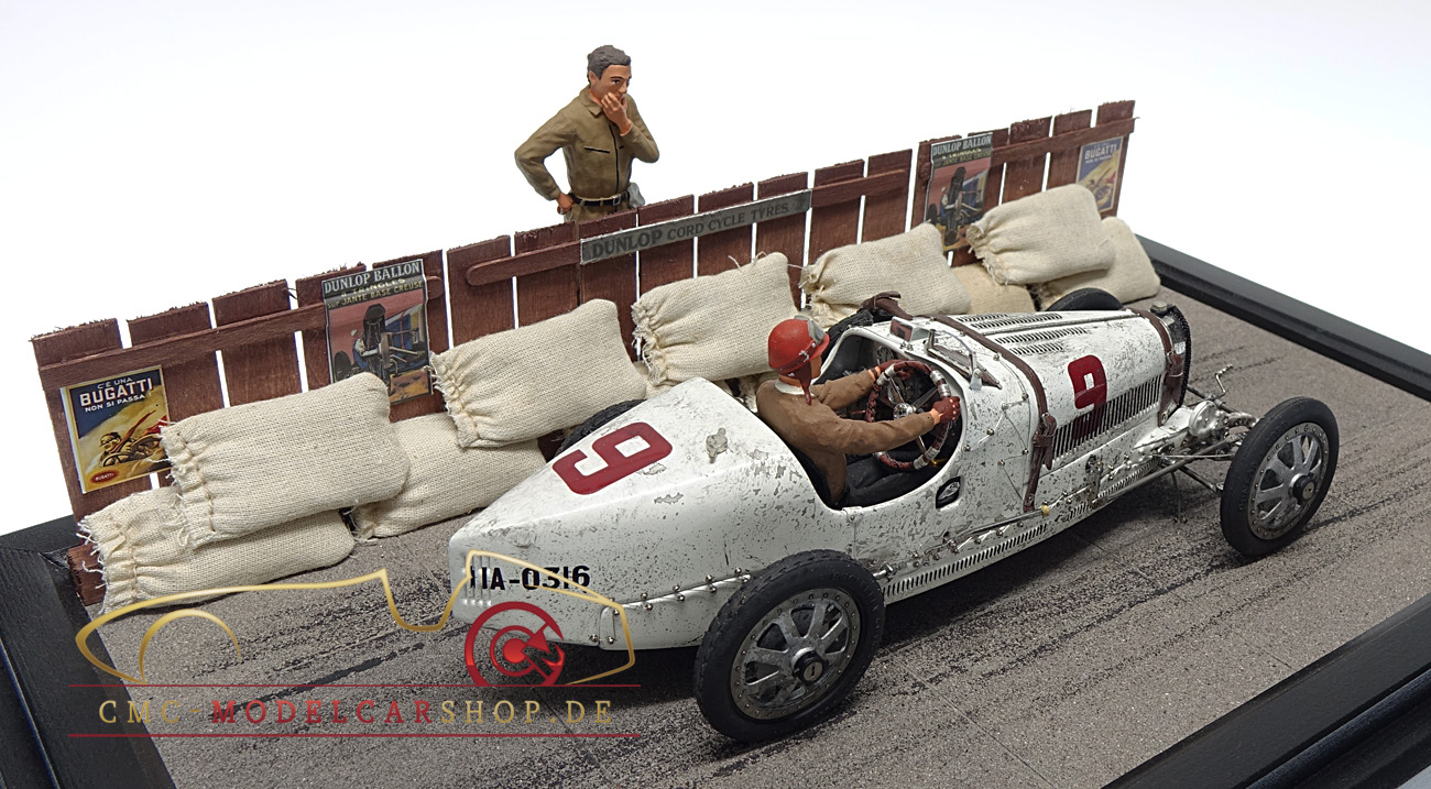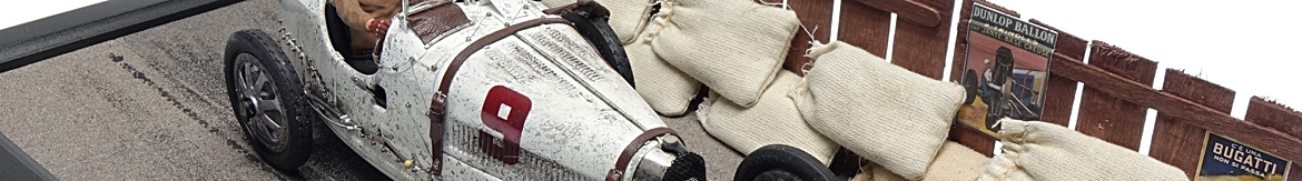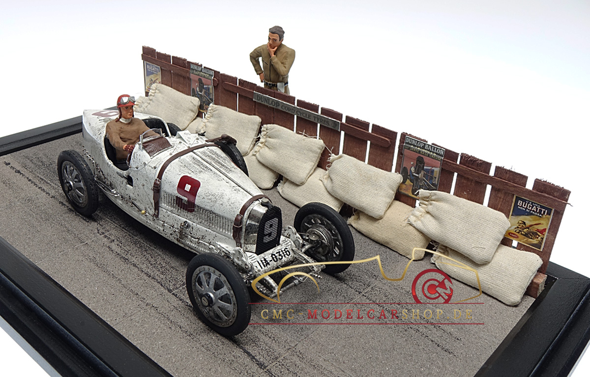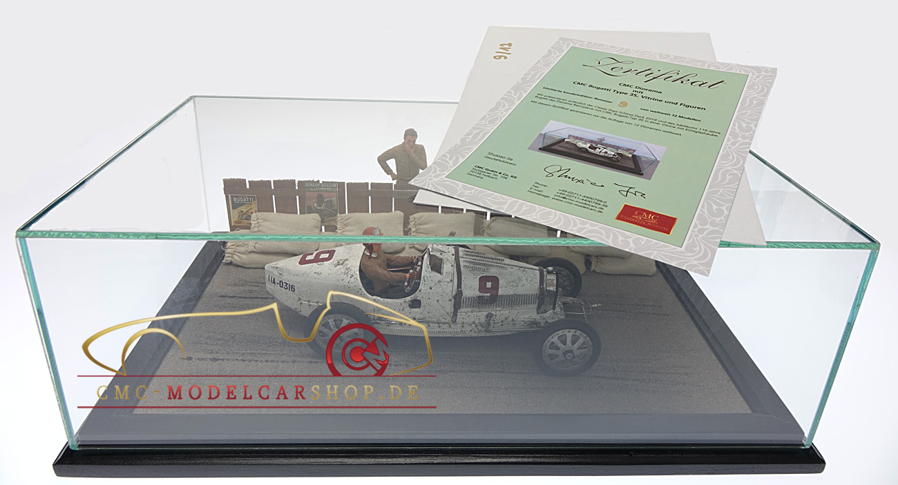 À l'occasion des Classic Days Schloss Dyck 2019 et des 110 ans de son anniversaire Bugatti CMC présente la scène de course de diorama dans une vitrine dotée d'un véritable capot en verre.